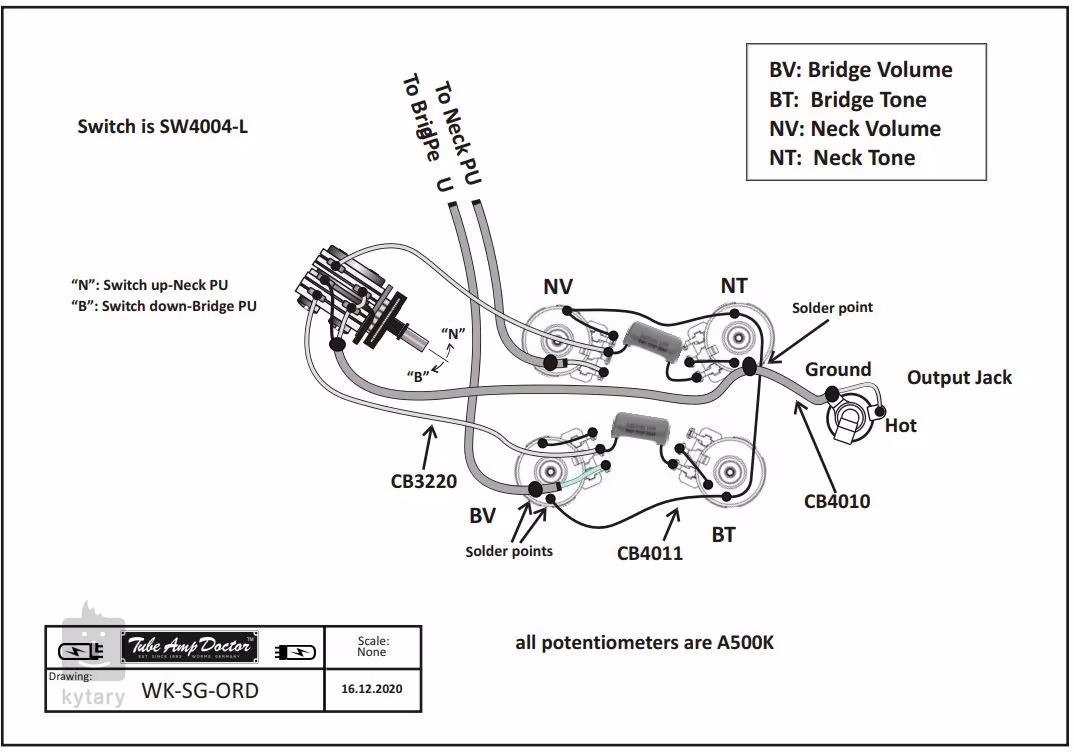 Srdcom sady sú štyri špeciálne vyrobené potenciometre CTS 500K s tzv. „dimple“ dizajnom, ktoré zabezpečujú plynulý chod a zachovávajú čistotu a výšky aj pri znížení hlasitosti, a to bez nutnosti použitia treble bleed obvodov. O legendárny vintage charakter tónu sa starajú dva kondenzátory Jupiter Bumblebee (Paper-in-Oil, 0,022 uF), ideálne na dosiahnutie zamatového „woman tone“. Spoľahlivosť a dlhú životnosť zaručuje profesionálny 3-polohový prepínač Switchcraft a výstupný konektor tej istej značky. V balení nájdete aj všetku potrebnú kabeláž v dobovom štýle a prehľadné schéma zapojenia.