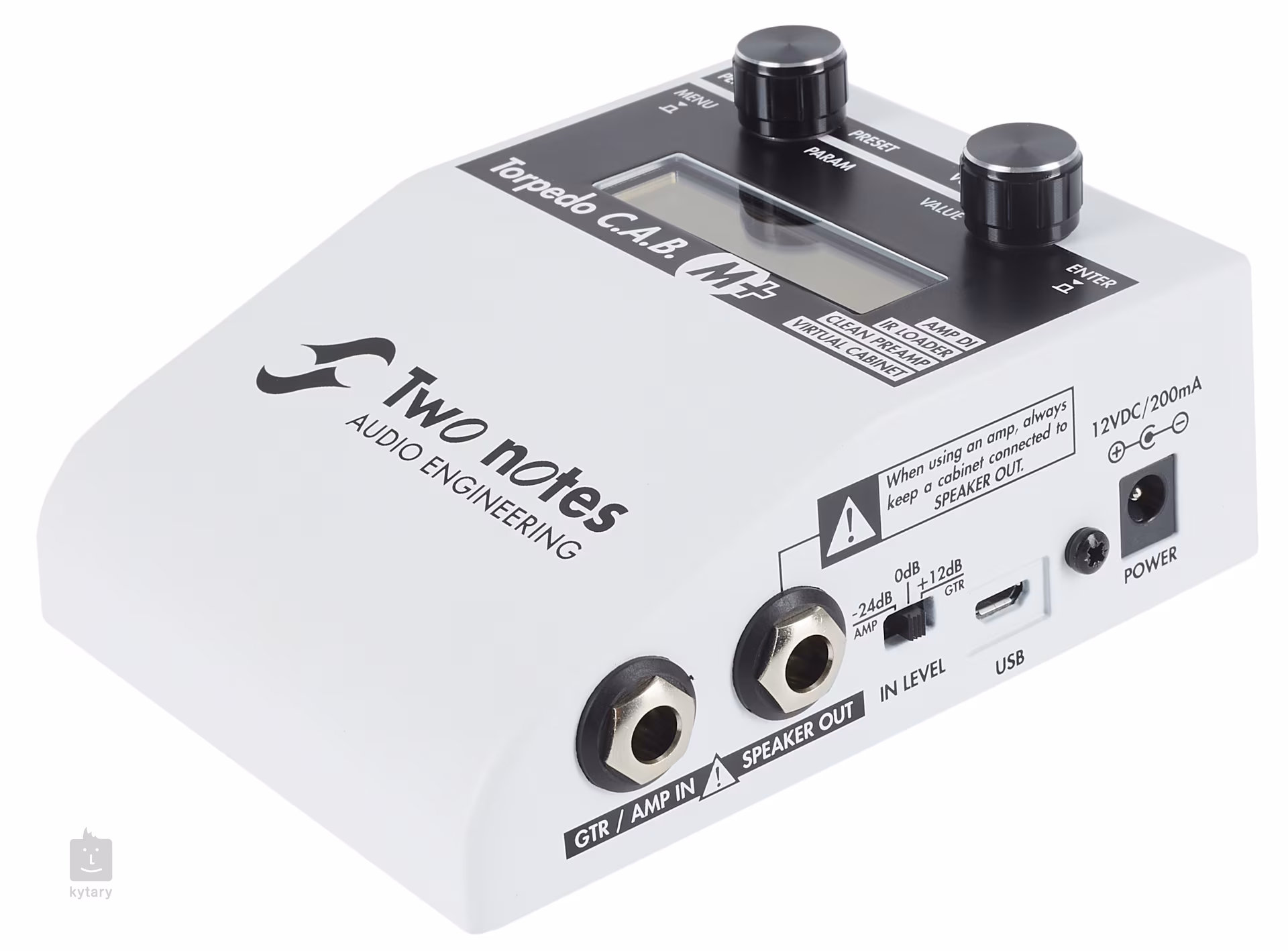 Torpédo C.A.B. M+ je simulátor reproduktorov (virtuálny reprobox), zosilňovač DI a IR loader v kompaktnej veľkosti pedálového efektu od etablovanej značky Two Notes, ktorý ponúka simulácie (IR s vysokým rozlíšením) 32 gitarových a basových reproduktorov známych značiek v špičkovej kvalite (27 gitarových plus 5 basových), osem mikrofónov (dynamické, kondenzátorové, ribbon) s možnosťou voľby ich umiestnenia a vzdialenosti od virtuálneho boxu, Clean Preamp (emulujúci '74 SilverFace B'man), virtuálny zosilňovač s možnosťou výberu EL84, EL34, 6L6, KT88 (pentóda alebo trióda) a obvodov triedy A a triedy A/B a užitočné štúdiové efekty a nástroje (Noise Gate, päťpásmový EQ, Enhancer, Reverb, IR Loader, ladička).