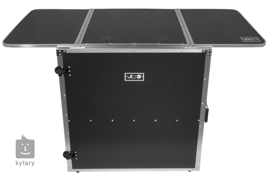 Stôl pre DJ má zaoblené rohy, otvor na vedenie káblov s krytom a polstrované gumové rukoväte. Vysoko odolná konštrukcia je vyrobená z kombinácie 9 mm preglejky s laminovaným šesťhranným povrchom a mimoriadne širokých hliníkových profilov.