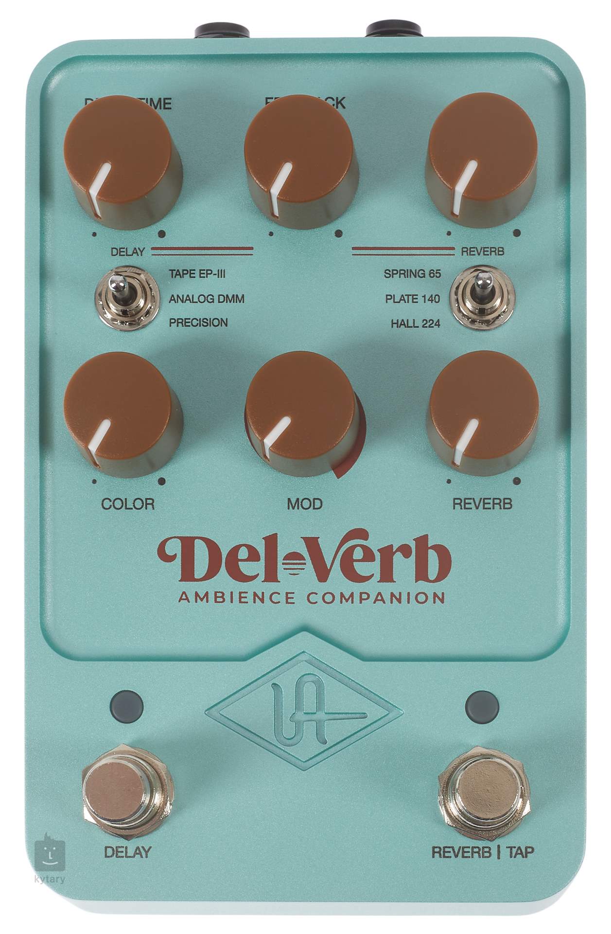 Universal Audio Del-Verb Ambience Companion je pedálový efekt 2 v 1, ktorý ponúka tri typy najpopulárnejších vintage efektov reverb (Spring 65, Plate 140, Hall 224) a delay (Tape EP-III, Analog DMM, Precision) z 60. a 70. rokov. Dva nožné spínače, tri prepínače typov efektov a šesť ovládačov vám poskytujú viac než dostatok možností na nastavenie zvuku podľa vašich predstáv – bez potreby prehľadávať prednastavenia.
