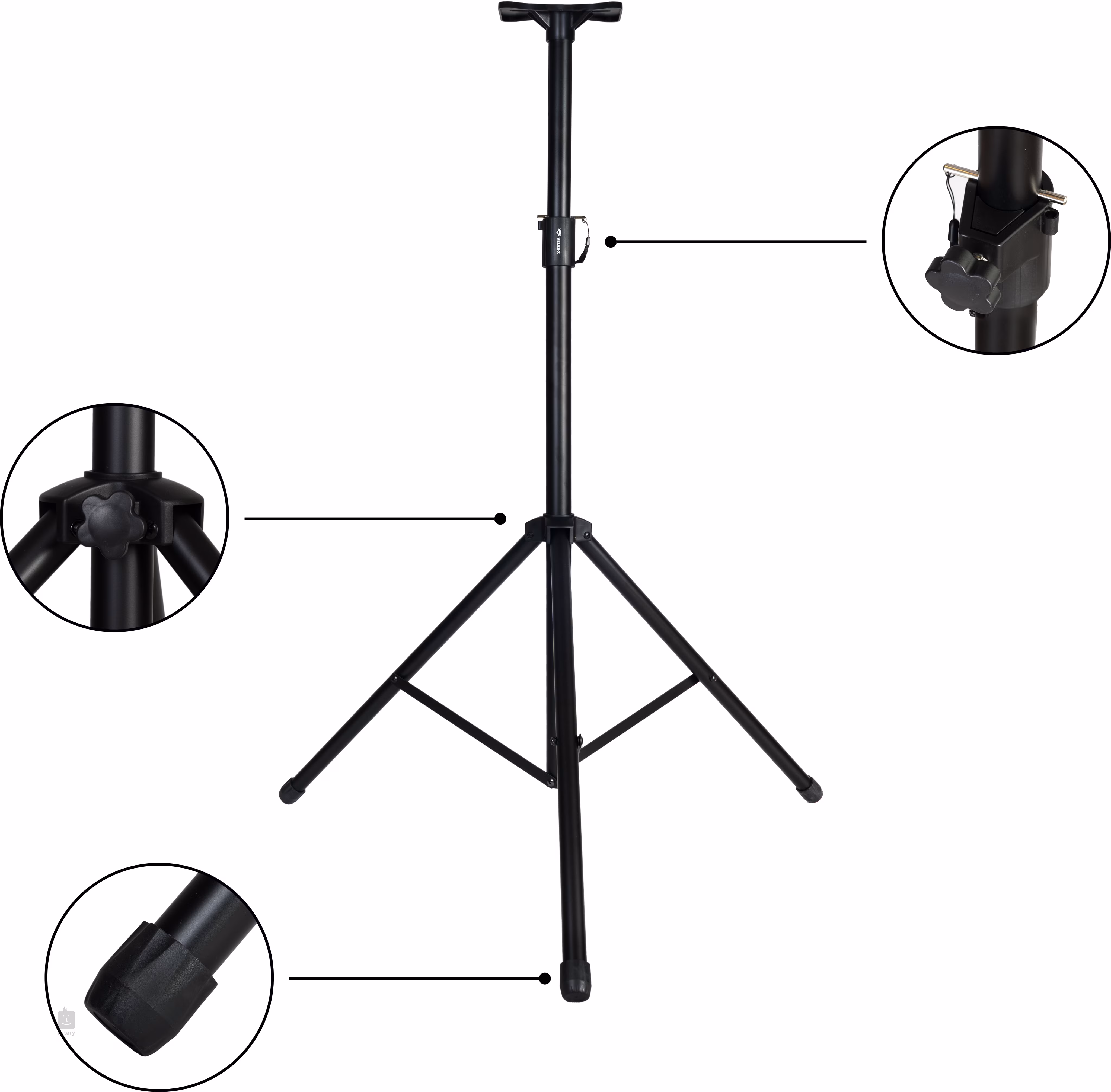 VELES-X Adjustable Tripod Speaker Stand V2 je robustný skladací stojan na reproduktory. Jeho pevná oceľová konštrukcia má nosnosť až 40 kg a je kompatibilná s PA reproduktormi s 35 mm uchytením (päticou) alebo štúdiovými a domácimi reproduktormi, pre ktoré je určená dodávaná základňa. Minimálna nastaviteľná výška je 94 cm, maximálna 178 cm. Na zaistenie sa používa bezpečnostný kolík. Súčasťou balenia je prenosná taška. Stojan váži 2,5 kg.