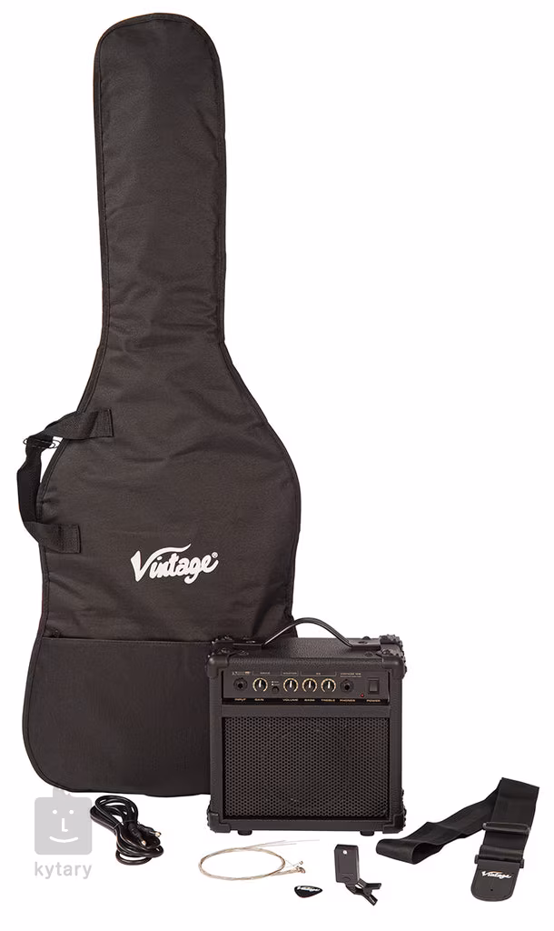 Balenie Vintage V10 Coaster Series Left-Handed Guitar Pack obsahuje elektrickú gitaru pre ľavákov, 10W gitarové kombo Kinsman, puzdro, gitarový popruh, nástrojový kábel, klipovú ladičku, trsátko a náhradnú sadu strún.