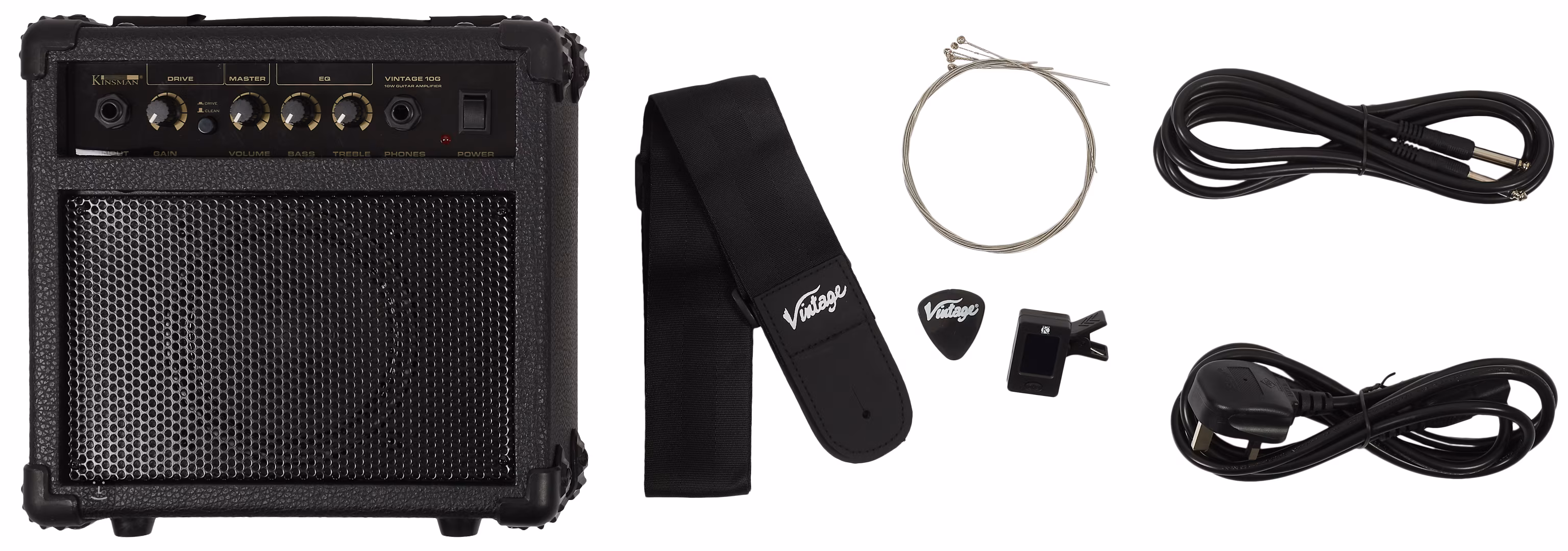 Gitarové balenie Vintage V10 Coaster Series obsahuje elektrickú gitaru, 10W gitarové kombo Kinsman, puzdro, gitarový popruh, nástrojový kábel, klipovú ladičku, trsátko a náhradnú sadu strún.