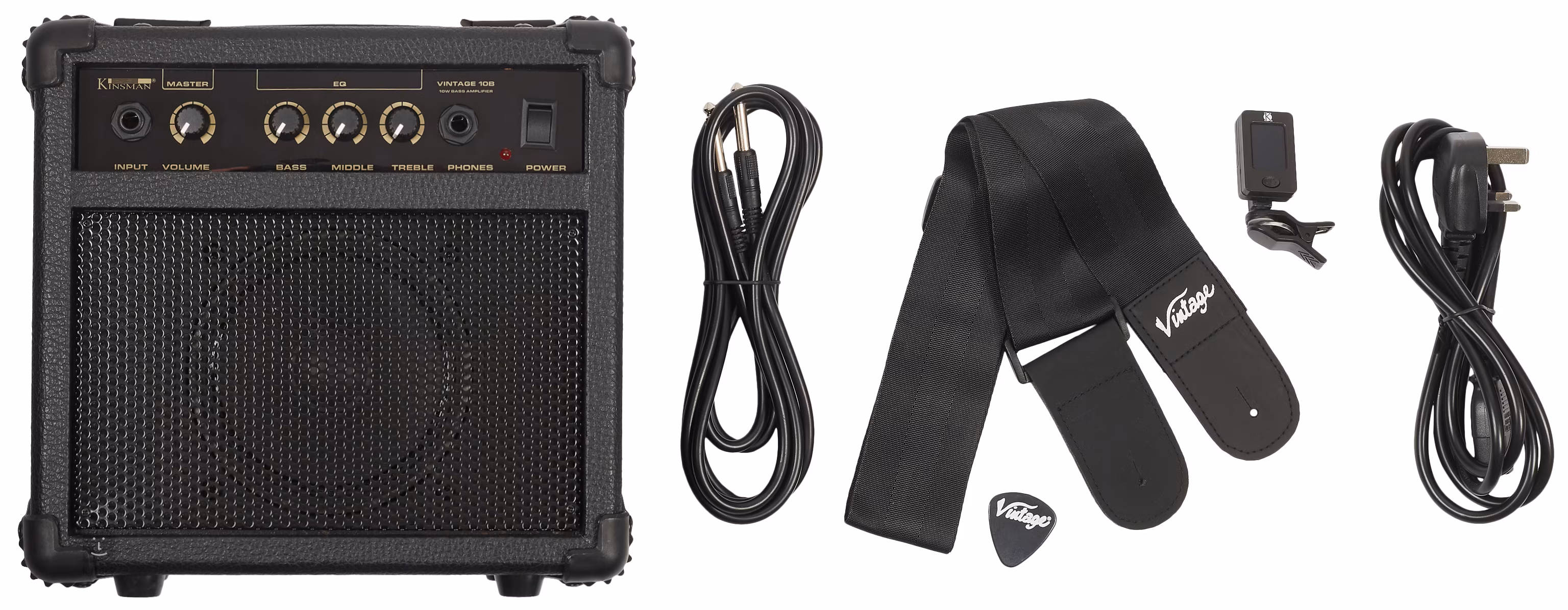Vintage Coaster V40 je ideálny ako prvá "vážna" basgitara pre rockových nadšencov. Toto balenie je určené pre hráčov, ktorí chcú mať všetko, čo k hre potrebujú. Balenie basgitary Vintage Coaster Series V40 okrem basgitary obsahuje trsátko, popruh, sadu strún, puzdro, nástrojový kábel, klipovú ladičku a 10W zosilňovač Kinsman s Master Volume a 3-pásmovým ekvalizérom.