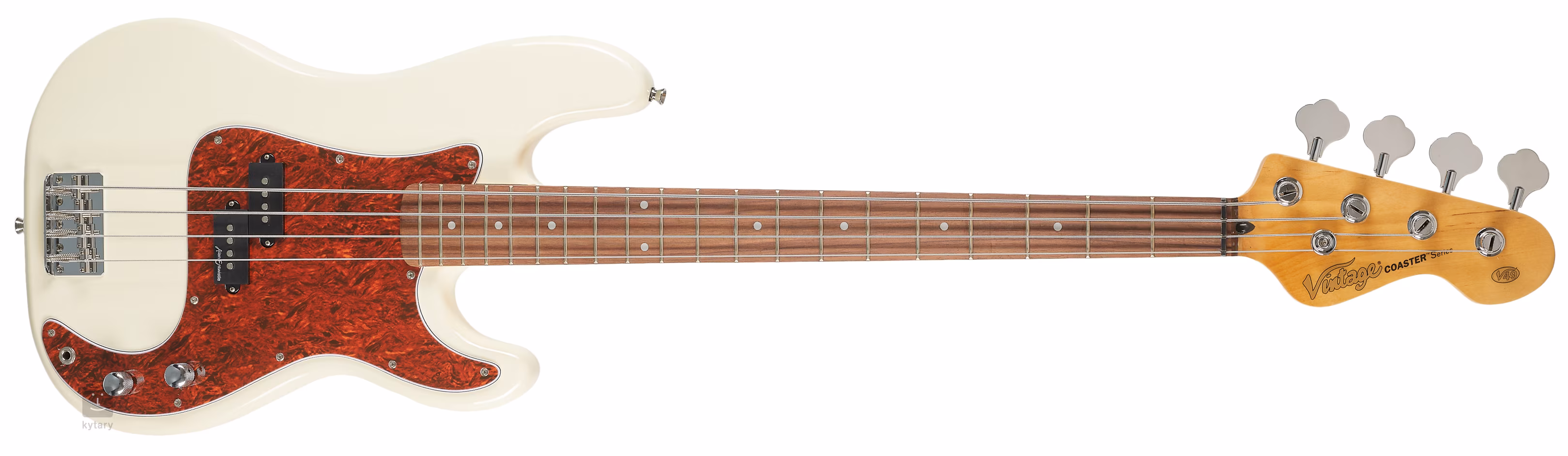Vintage Coaster V40 je elektrická basgitara s pôsobivým dizajnom a špičkovými funkciami, ktorá poteší začiatočníkov aj skúsenejších hráčov. Vďaka telu s dvojitým výrezom, 3-vrstvovému pickguardu a chrómovému hardvéru pôsobí tento nástroj elegantne a moderne. Rýchly palisandrový hmatník s 20 pražcami, skrutkovaný javorový krk a telo z paulovnie ponúkajú skvelú rovnováhu výšok, stredov a basov, ktoré sú prenášané s výnimočnou čistotou.