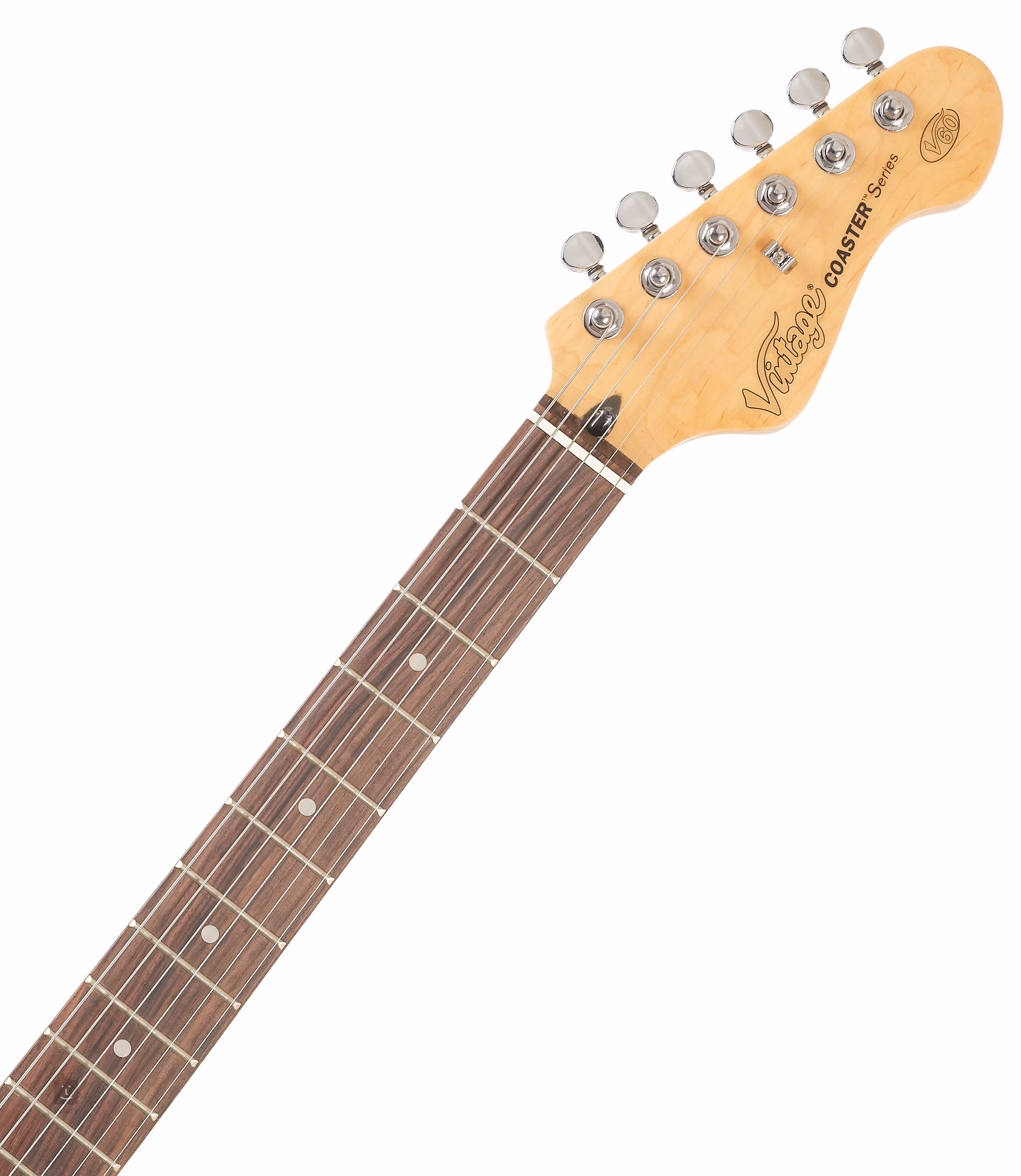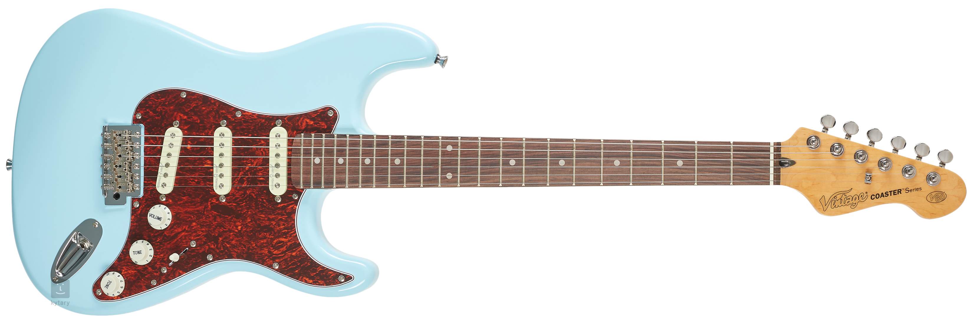 Vintage V60 Coaster Series Laguna Blue je elektrická gitara s dvojitým výrezom v tvare modelov ST. Telo nástroja je vyrobené z dreva ázijského stromu pavlovnia. K priskrutkovanému javorovému krku je prilepený palisandrový hmatník s dvadsiatimi dvoma pražcami.