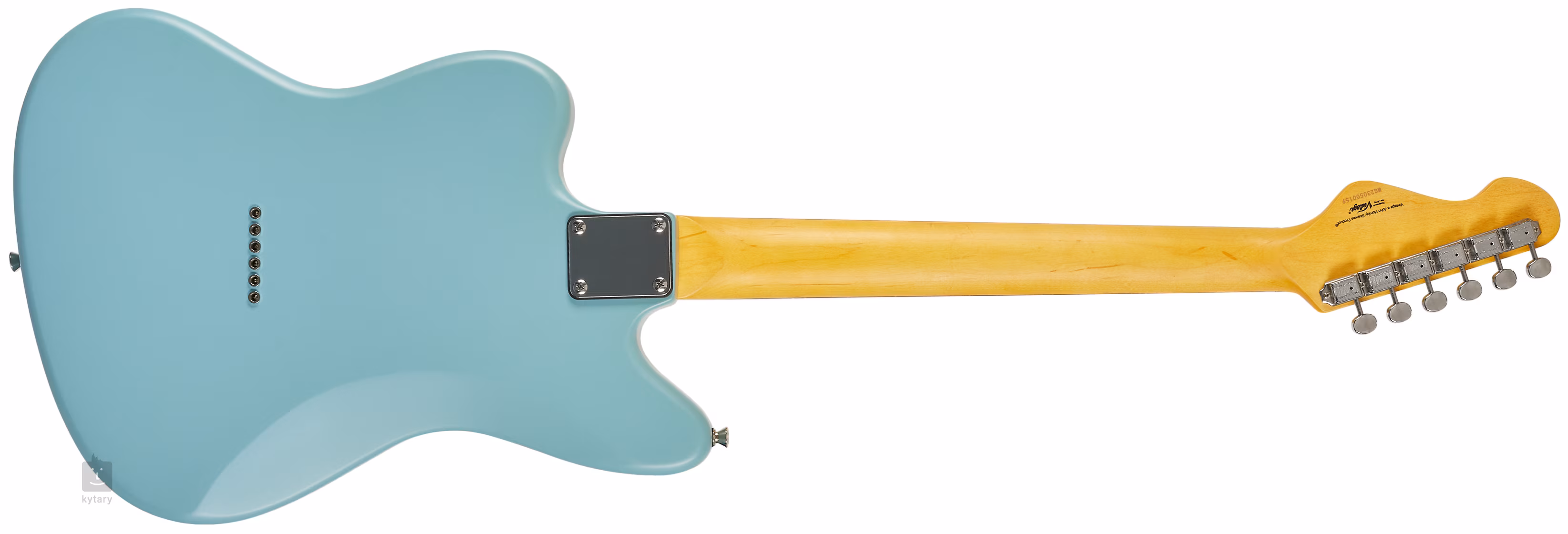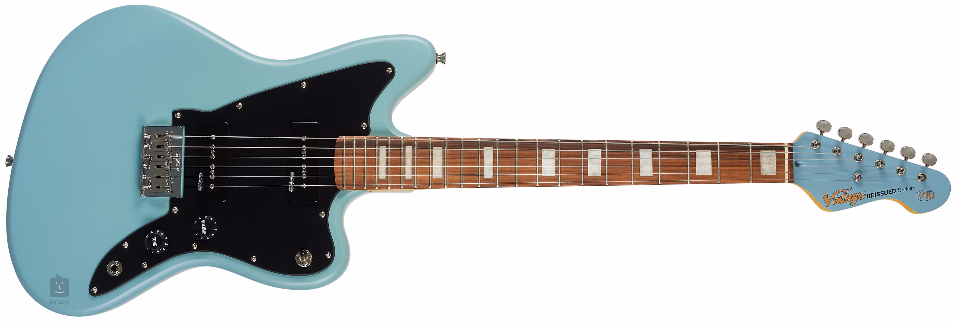 Elektrická gitara VINTAGE V65HBL má klasický offsetový dizajn tela, ktorý určite osloví širokú škálu začínajúcich aj skúsených gitaristov. Olšové telo gitary zdobí povrchová úprava Satin Blue. K priskrutkovanému jednodielnemu javorovému krku je prilepený palisandrový hmatník osadený dvadsiatimi dvoma Medium Jumbo pražcami a polohovými blokmi.