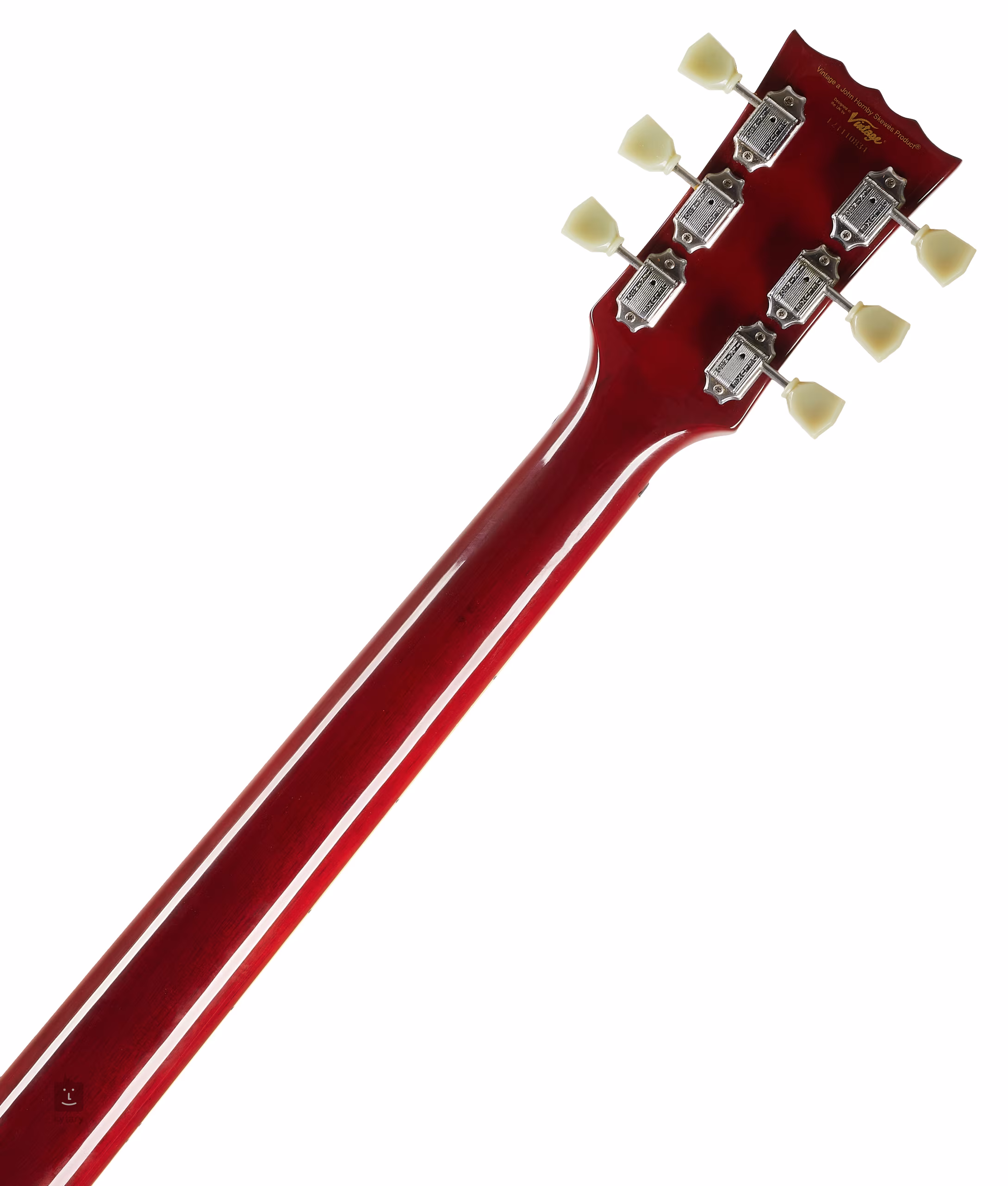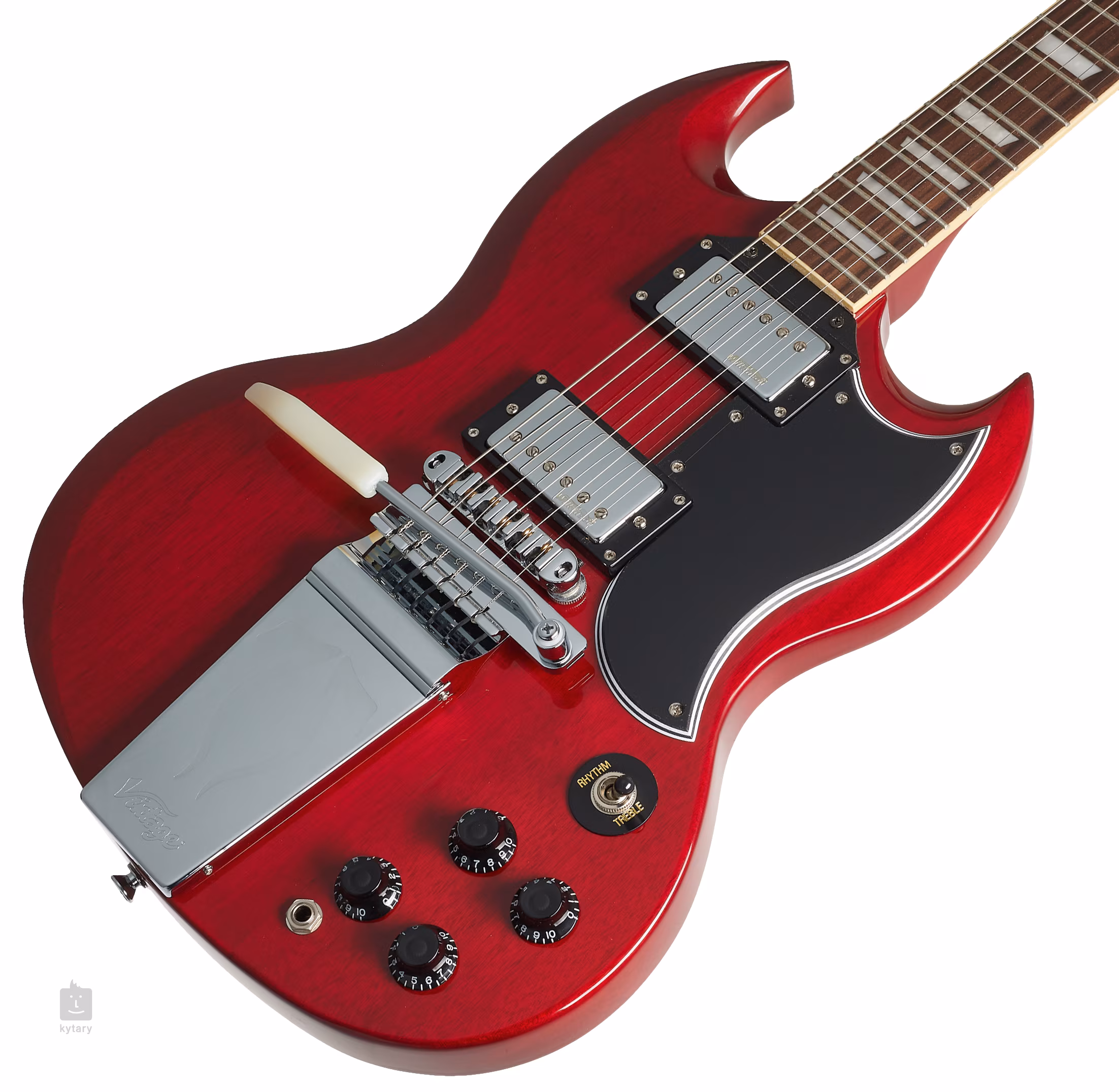 Vintage VS6VCR je štýlová elektrická gitara v dizajne double-cut SG zo série Vintage Reissued Series. Telo nástroja je vyrobené z mahagónu. K krku z jedného kusu mahagónu s príjemným profilom „Soft C“ je prilepený palisandrový hmatník osadený dvadsiatimi dvoma pražcami veľkosti Medium Jumbo.