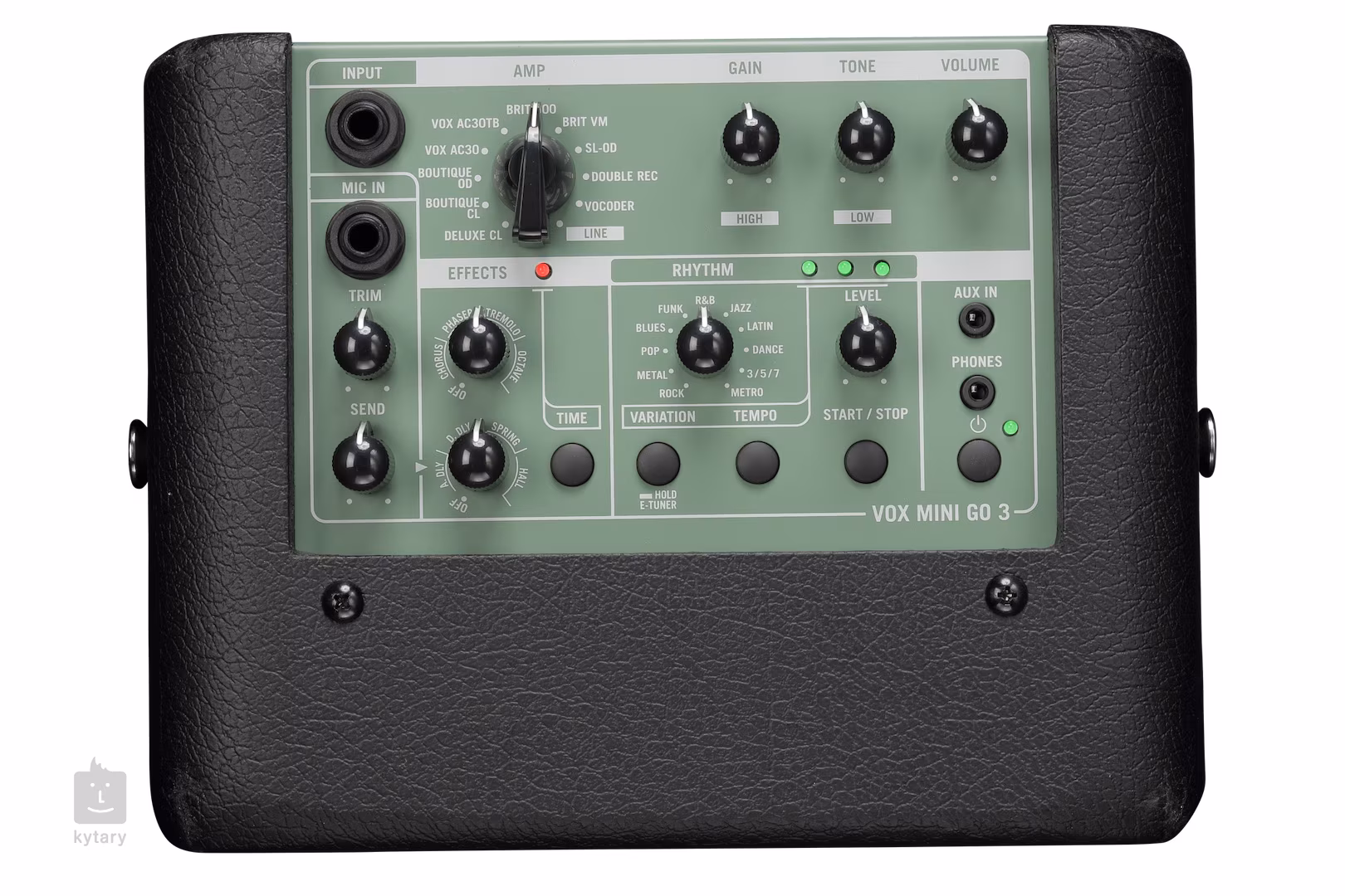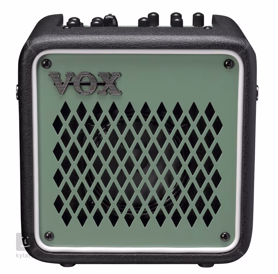 Vox Mini Go 3 Olive Green je ľahké, kompaktné kombo s emuláciami gitarových zosilňovačov prevzatými z Vox Cambridge50 (DELUXE CL, BOUTIQUE CL, BOUTIQUE OD, VOX AC30, VOX AC30TB, BRIT 800, BRIT VM, SL-OD, DOUBLE REC), režimom vocoder s efektom modulácie hlasu (VOCODER) a modemom (LINE) vhodným pre elektroakustické gitary alebo klávesy, ôsmimi vstavanými efektmi (CHORUS, PHASER, TREMOLO, OCTAVE, ANALOG DELAY, DIGITAL DELAY, SPRING, HALL), tridsaťtri rytmických bicích vzorov (3 variácie pre žánre ROCK, METAL, POP, BLUES, FUNK, R&B, JAZZ, LATIN, DANCE 3/5/7, METRO), vstupy pre nástroje a mikrofóny, vstup Aux pre externé audio zdroje, výstup pre slúchadlá, vstavaný ladič a možnosť napájania zariadenia pomocou adaptéra alebo batérie mobilného telefónu (cez micro USB).