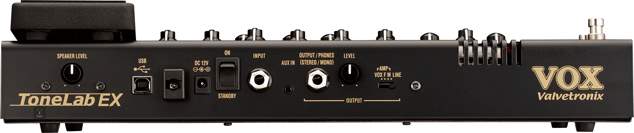 Výstupní jack poskytuje přepínání výstupu Amp/Line podle toho, která možnost je v dané chvíli optimální. Pro natáčení, zapojení do koncového zesilovače nebo zapojení přímo do mixážního pultu použijte polohu Line a využijte koncového ekvalizéru ke konečné úpravě zvuku. Když zapojujete ToneLab EX přímo do kytarového aparátu použijte polohu Amp a vyberte si buď nastavení VOX (pro aparáty VOX), F (pro aparát s otevřenou zadní deskou amerického typu se spíše čistým zvukem) nebo M (když používáte typický britský aparát se samostatným zesilovačem a kabinetem). Tato funkce zajišťuje, že maximálně využijete zvukové možnosti ToneLab EX. Jack AUX IN umožní připojit externí audio zdroj – třeba CD nebo MP3 přehrávače – a díky tomu lze jamovat s oblíbenými skladbami. ToneLab prostě poskytuje kytaristům to největší pohodlí.