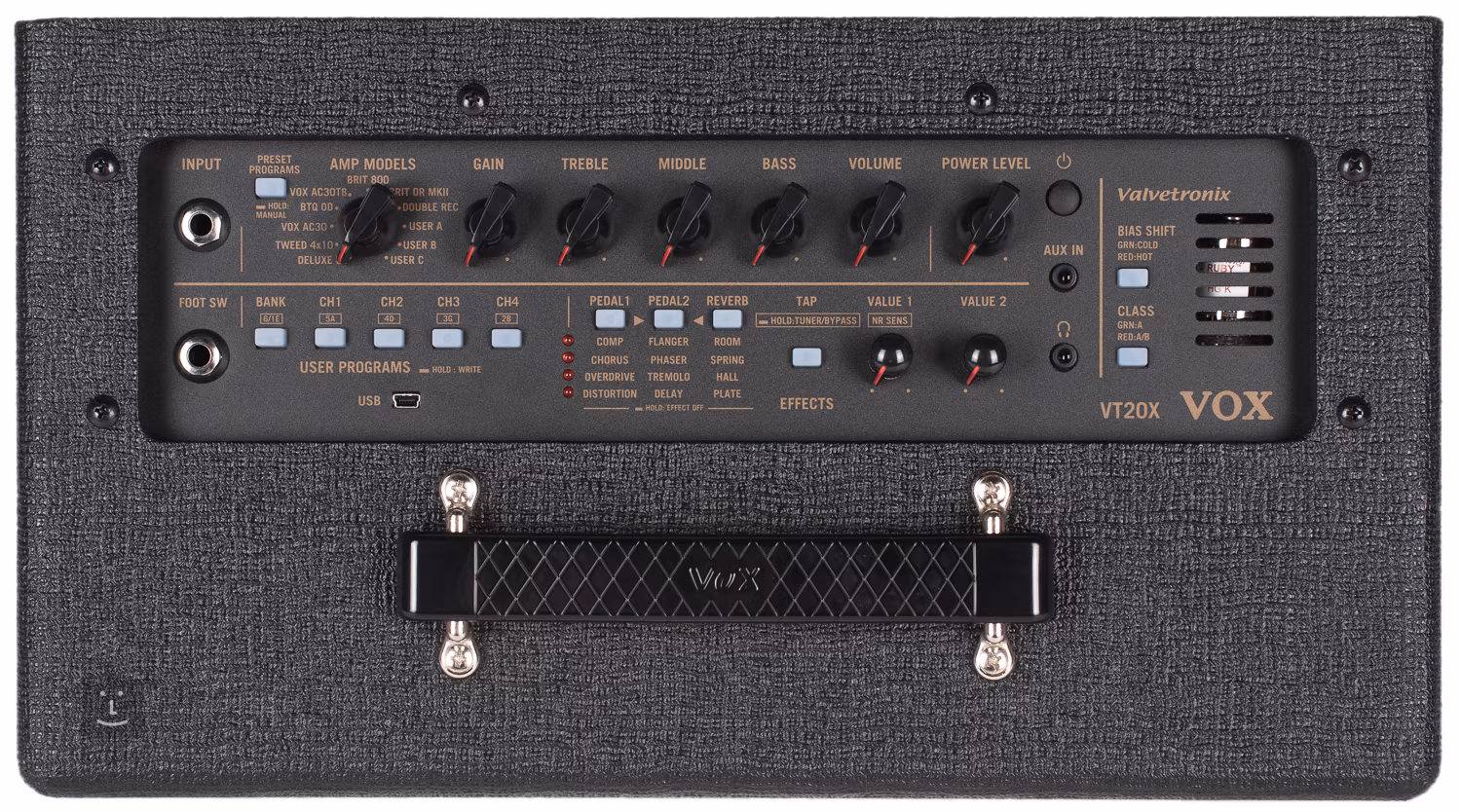 Hlavný panel je vybavený štandardnými ovládačmi (trojpásmový ekvalizér, hlasitosť, zosilnenie) a prepínačmi (možnosť prepínania medzi režimami Bias a Class A a Class AB). K dispozícii je tiež USB port pre jednoduchú integráciu s počítačom (PC/Mac), tabletom, telefónom (iOS/Android) a následnú úpravu v softvéri Vox Tone Room, ako aj ovládací prvok Tap Tempo, ktorý vám umožňuje prispôsobiť efekty tempu vašej hry.