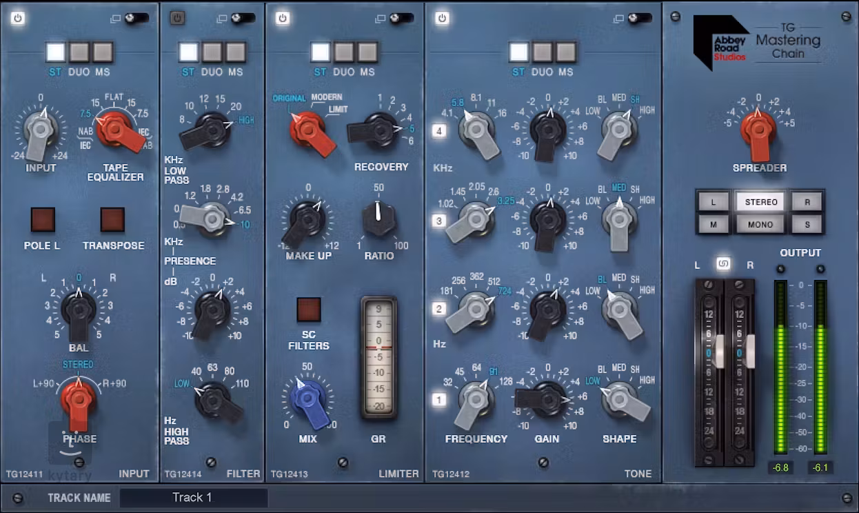 Kompletný reťazec masteringu Abbey Road Prenosový pult EMI TG12410 definoval zvuk štúdií Abbey Road od 70. rokov minulého storočia až po súčasnosť. Spoločnosť Waves teraz vymodelovala tento magický masteringový reťazec do posledného detailu a pridala moderné funkcie navrhnuté v spolupráci so štúdiami Abbey Road. Vďaka modulárnym sekciám Input, Tone, Compression/Limiting, Filter/EQ a Output/Stereo Spread môžete teraz dodať charakteristickú zvukovú príchuť a kontrolu svojim masterom, zberniciam, skupinám a dokonca aj jednotlivým stopám.