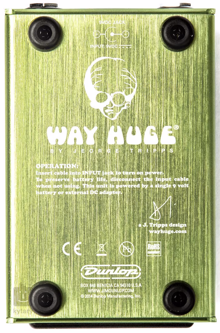 Pedálový efekt Way Huge Green Rhino Mark 4 je kompaktný overdrive pedál inšpirovaný zvukom a dizajnom slávnej zelenej krabičky. Dobre poslúži ako "dirt" pedál na vyčistenie zvuku nástroja a ako "nakopávač" a EQ pred overdrive/distortion kanálom zosilňovača. Štandardné ovládače Volume, Tone a Drive dopĺňajú dva miniatúrne ovládače na úpravu zvuku v oblasti nižších stredových a basových frekvencií. Preklopením prepínača sa tieto dva gombíky obídu a krabička bude fungovať ako pôvodný model Green Rhino Overdrive.