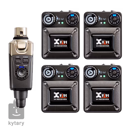 XVive U4 - Bundle, 1x vysielač + 4x prijímač je bezdrôtový monitorovací set do uší s kvalitou digitálneho prenosu 24 bitov/48 kHz, latenciou 5 ms, systémom 2,4 GHz s dosahom viac ako 20 metrov a vstavanou lítium-iónovou batériou s výdržou až päť hodín na jedno nabitie (nabíjanie cez USB). Balenie obsahuje vysielač, ktorý pripojíte k zdroju zvuku (mixpult, audio rozhranie), štyri prijímače na opasok, ktoré pripojíte k slúchadlám, 3x USB-Y kábel a redukciu XLR/6,3 mm TS.
