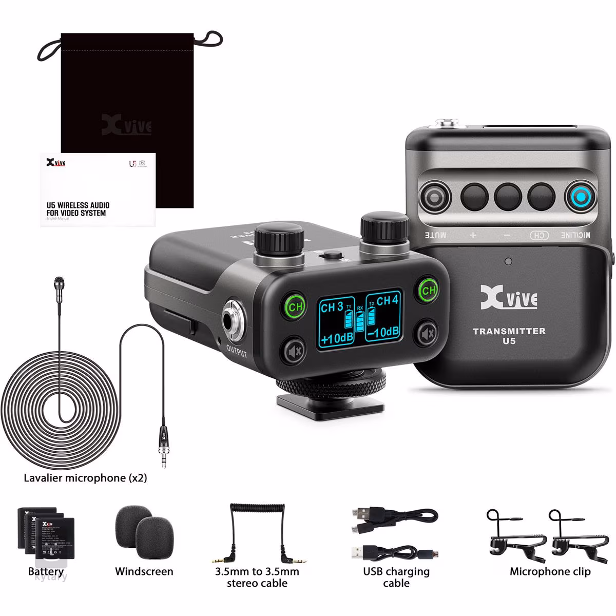 XVive U5 je bezdrôtový zvukový systém s klopovým mikrofónom (LV1) ideálny na nahrávanie videí, rozhovorov a podcastov - možno ho použiť s digitálnymi zrkadlovkami a prakticky v akejkoľvek situácii, ktorá si vyžaduje bezdrôtový prenos zvukového signálu. Systém pracuje na frekvencii 2,4 GHz. Vysielač na opasku je kompatibilný s klopovými mikrofónmi (ako je priložený mikrofón XVive LV1) a prijímač sa dodáva s adaptérom na upevnenie na topánku na pripojenie k digitálnym zrkadlovkám.