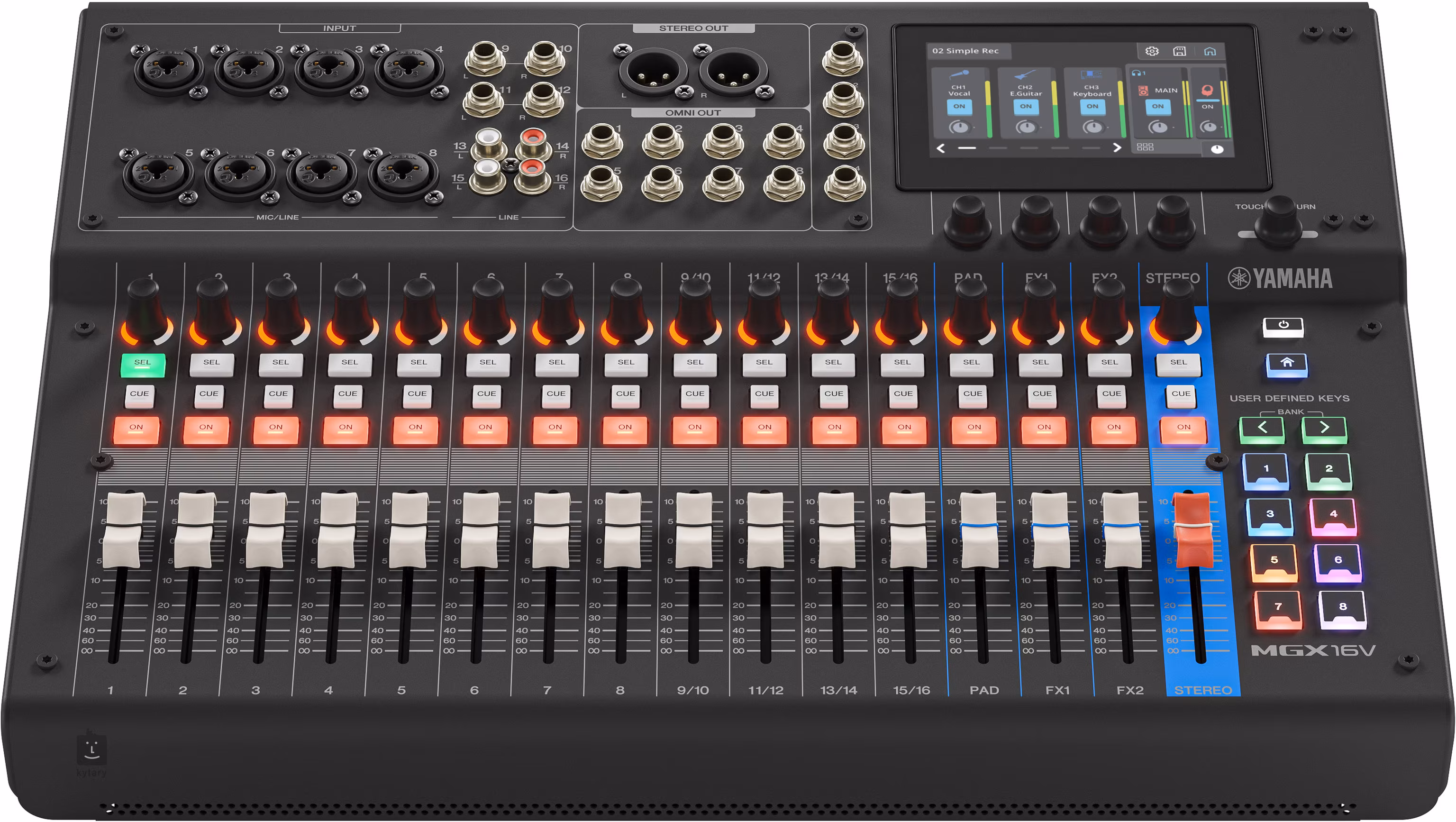 Ovládacie prvky sú založené na konfigurácii 15 + 1 nemotorizovaných faderov a prehľadnom 4,3" dotykovom displeji s piatimi ovládacími gombíkmi, takže máte okamžitý prístup k dôležitým funkciám bez zdĺhavého „prechádzania menu“. Architektúra mixážneho pultu ponúka 8 mono + 4 stereo kanály, samostatný kanál Sound Pad a 2 FX returny – to všetko doplnené 1 STEREO + 8 MIX zbernicami, ktoré umožňujú flexibilné smerovanie pre pódiové monitory, streamovanie mixu alebo nahrávanie.