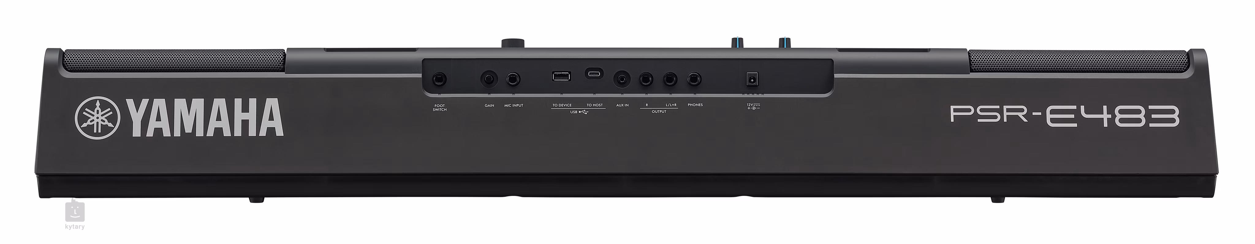 Nástroj je vybavený vstavanými reproduktormi 2x 6 W, ktoré poskytujú dostatočne silný a čistý zvuk pre domáce hranie a menšie vystúpenia. USB pripojenie umožňuje jednoduchú integráciu s počítačom, tabletom alebo smartfónom pre MIDI komunikáciu a prácu s hudobnými aplikáciami. K dispozícii je tiež vstup pre mikrofón, výstup pre slúchadlá, vstup AUX IN pre prehrávanie externých zdrojov a možnosť napájania z batérie, vďaka čomu je PSR-E483 vhodný na hranie mimo dosahu elektrickej siete.