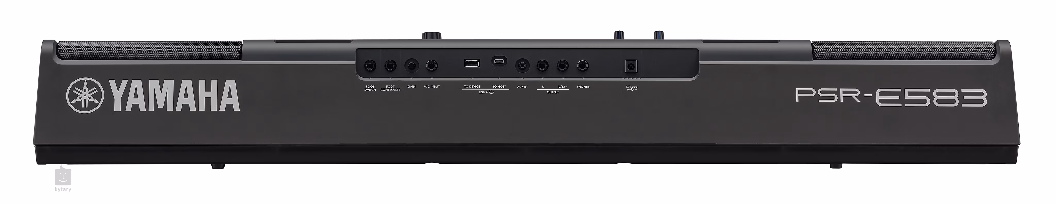 Nástroj je vybavený vstavanými reproduktormi 2x 12 W, ktoré poskytujú dostatočne silný a čistý zvuk pre domáce hranie a menšie vystúpenia. USB pripojenie umožňuje jednoduchú integráciu s počítačom, tabletom alebo smartfónom pre MIDI komunikáciu a prácu s hudobnými aplikáciami. K dispozícii je tiež vstup pre mikrofón, výstup pre slúchadlá, vstup AUX IN pre prehrávanie externých zdrojov a možnosť napájania z batérie, vďaka čomu je PSR-E583 vhodný na hranie mimo dosahu elektrickej siete. V porovnaní s predchádzajúcimi modelmi je k dispozícii aj vstup pre expresívny pedál, ktorý výrazne rozširuje možnosti expresívneho ovládania.