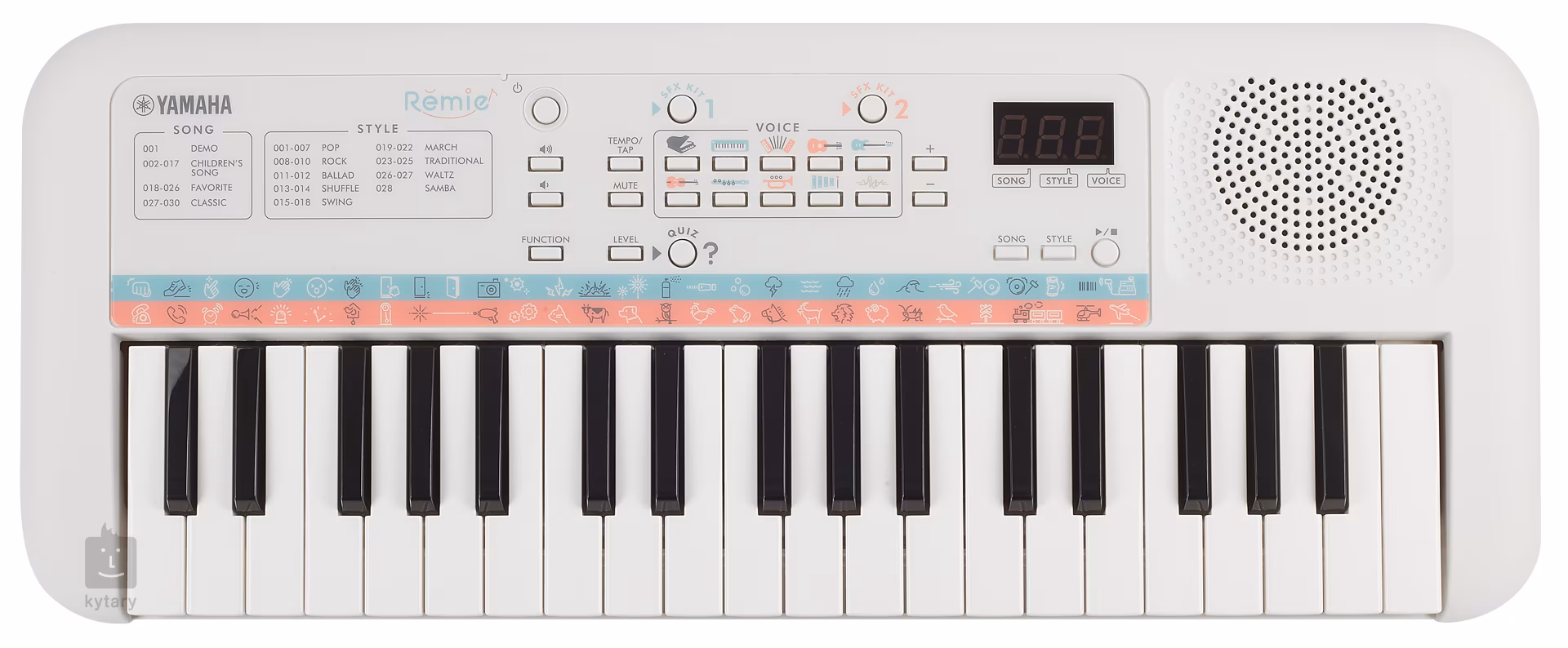 Nástroj sa skladá z 37 kvalitných minikláves a v malej odolnej konštrukcii nájdete až 49 zvukov, 74 zvukových efektov alebo 28 hudobných sprievodov a funkcie Smart Chord. Integrovaná pamäť obsahuje až 30 predinštalovaných skladieb a režim Quiz na učenie sa o nástrojoch alebo zvukoch zvierat, čo ocenia najmä vaši najmenší. Súčasťou je aj bezplatný spevník na stiahnutie, z ktorého si môžete stiahnuť svoju obľúbenú pieseň a prehrávať si melódie alebo spievať spolu s ňou. Model E30 ponúka metronóm, funkciu Sustain, flexibilné možnosti pripojenia a intuitívny ovládací panel s prehľadným displejom. Vaše dieťa si môže jednoducho zabaliť kľúče do batohu a zažiariť s nimi na hodine hudobnej výchovy alebo oživiť rutinu pri táboráku. Klávesy možno napájať batériou veľkosti AA alebo cez port USB.