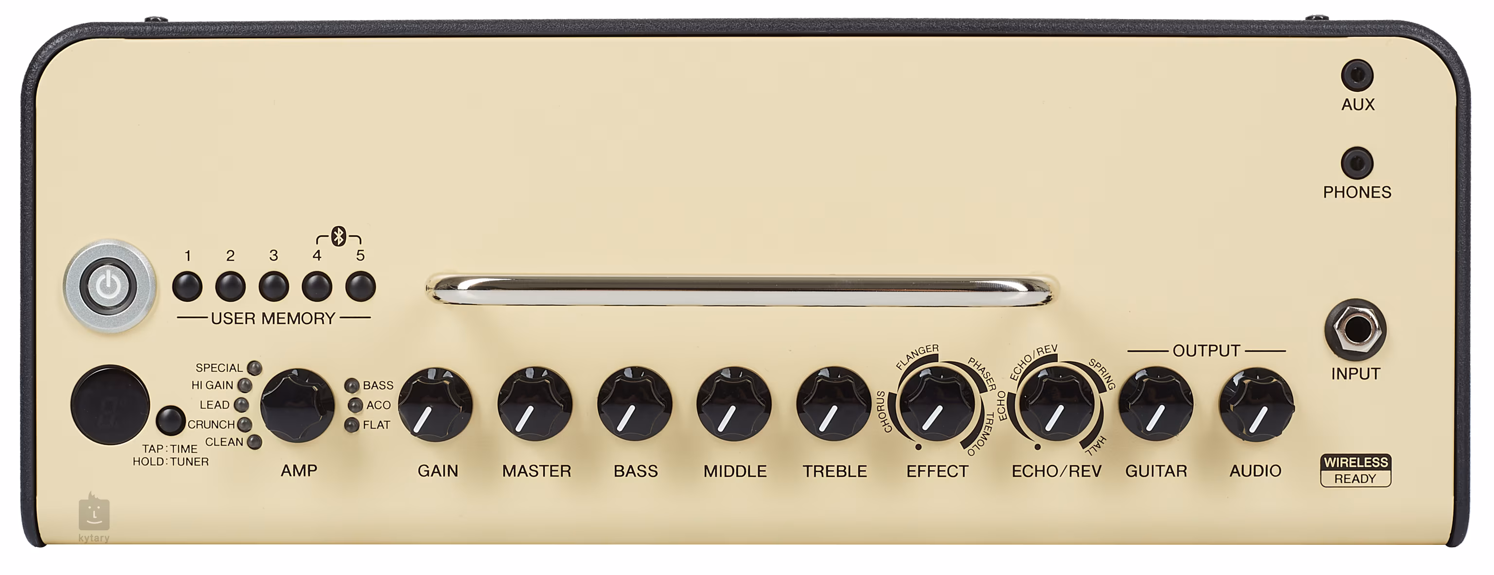 Amp Selector, Gain, Master, Bass, Middle, Treble, Effect, Echo/Rev, Guitar Output, Audio Output, 5x User Memory, Bluetooth, Tap/Tuner