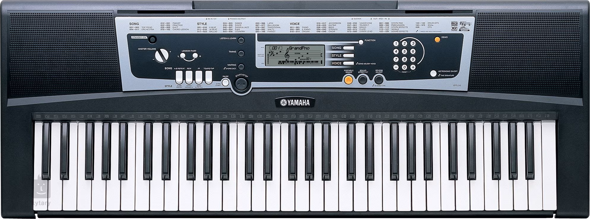 YPT-210 přináší 375 přirozeně znějících zvuků, včetně stereo zvuku klavíru, 361 zvuků XGlite, 12 bicích sad a sady zvukových efektů. YPT-210 je také vybavena 100 doprovodnými styly a 102 vestavěnými písněmi a skladbami. Pro snadné vyvolání stereo zvuku piána stačí stisknout pouze tlačítko Portable Grand. Nástroj disponuje také bohatým efektem Reverb, který přidá například dozvuk koncertního sálu k vaší hře. Výukový systém Y.E.S. (Yamaha Education Suite) dělá učení a cvičení ještě více zábavnější než kdykoli předtím.