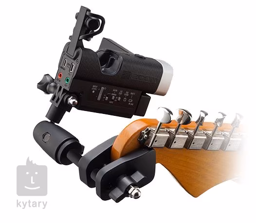 Držiak kamery, ktorý slúži na pripevnenie videorekordérov Zoom Q4 a Q8 na hlavu elektrických gitár a basgitár.